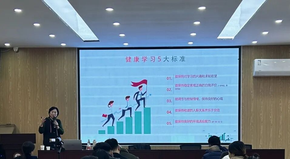 讲座介绍了青少年健康心理状态、健康学习的五大标准和好习惯学习法等内容,具体分析了青少年厌学的原因,比如社会因素、家庭因素、学校因素、自我因素等一系列的问题无法得到疏导和解决,使学生感觉非常无助,从而产生厌学情绪。陈老师结合实际案例,重点讲述了厌学行为预警,比如学生身体开始频繁生病、上学常常抱怨很累、情绪低落、回避学习甚至学校相关的话题等,详细讲述了应对方法,比如对学生要及时关心不质疑、帮助建立紧密愉悦的关系、学校和家长统一思想、增加课堂参与性等诸多方面综合的、持续的对学生表达友好和关注。