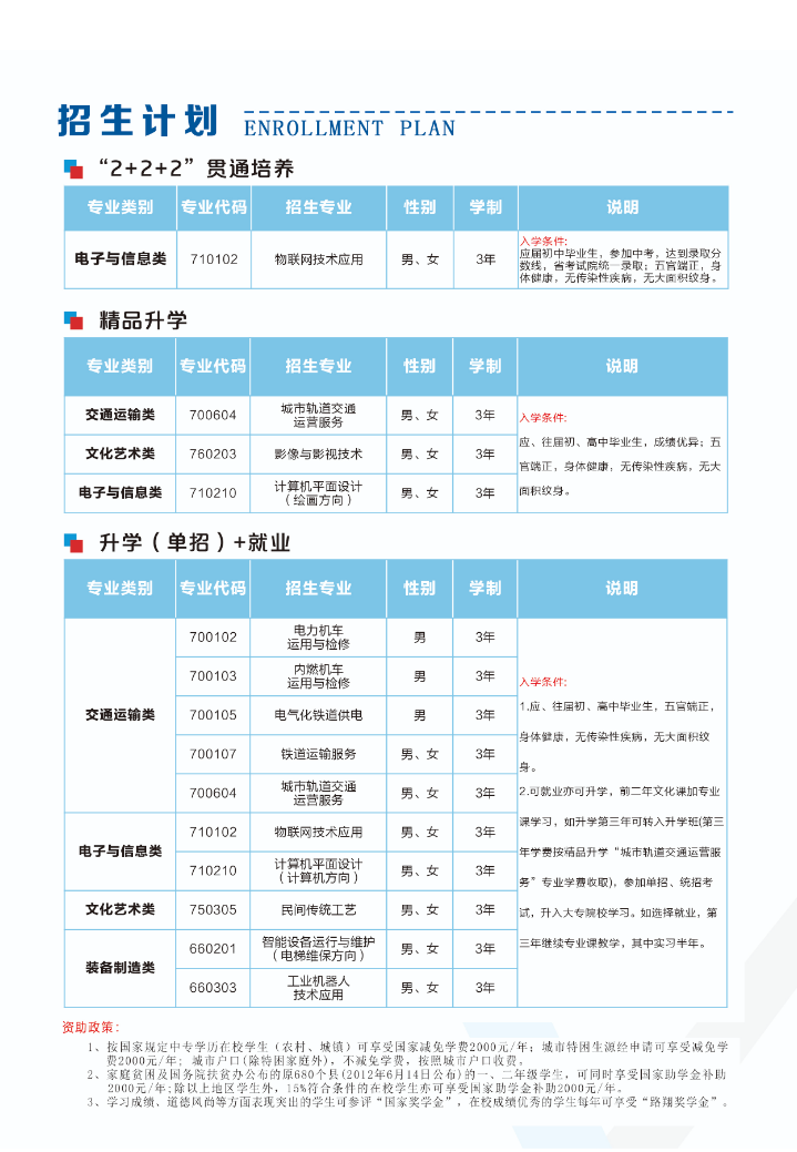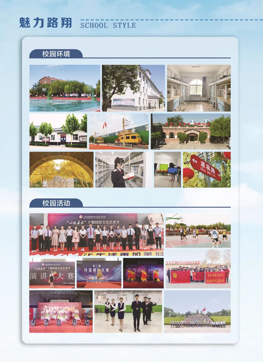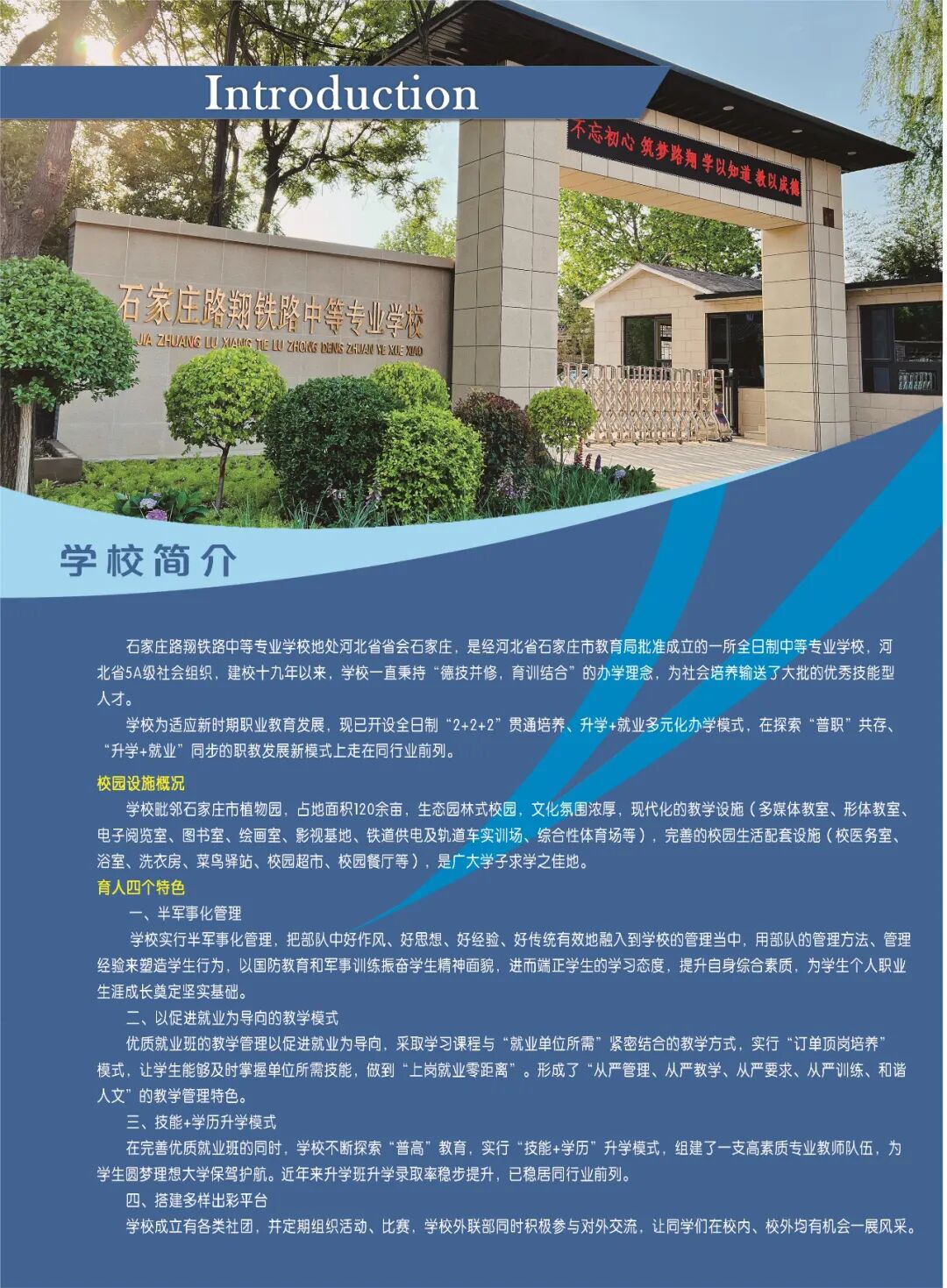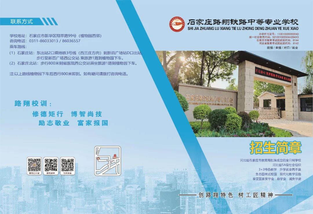 石家庄路翔铁路中等专业学校是经河北省石家庄市教育局批准成立的一所全日制中等专业学校,建校十九年以来,学校一直秉持着“德技并修,育训结合”教育理念,为社会培养输送了大批的技能型人才,得到了用人单位的一致好评和广大认可;被河北省民政厅批为5A级社会组织。 为适应新时期职业教育发展,学校现在设有“普高”升学班,分四大专业类别,共六个专业;设置“优质”就业班,分两大专业类别,共七个专业。2024年,经河北省教育厅批准,我校物联网技术应用专业将实施“2+2+2”贯通培养模式,联办高校—石家庄工程职业学院,联办企业—石家庄国创明慧物联网科技有限公司,标志着我校在探索“普职”共存、校企联合协调发展上迈出了新的一步。 学校毗邻石家庄市植物园,生态园林式的校园、浓厚的文化氛围、现代化的教学设施、完善的校园生活配套设施、老中青相结合的师资队伍、科学的育人体系等,都为学子们的成长、成才之路,夯实了坚定的基础。 教学区 运动场 求实路 阅读长廊 宿舍区 影视社团文化活动 文艺晚会 表彰大会获奖人员合影 红歌合唱比赛 周一升旗仪式 队列比赛 内务比赛学习生活 形体教室 阅览教室 美术画室 计算机室 实训现场 摄制实践生活环境 文化展廊 就餐食堂 学生公寓 校园超市 学生浴室 校园操场资助政策 1、按国家规定中专学历在校学生(农村、城镇、城市低保户)可享受国家减免学费2000元/年。 2、原家庭贫困及国务院扶贫办公布的680个县(2012年6月14日公布) 的学生,可同时享受国家助学金补助2000元/年;15%符合条件的在校生,亦可享受国家助学金补助2000元/年。 3、按国家规定享受国家奖学金6000元/年。 4、成绩优异的学生每年可享受“路翔奖学金” 。 5、学校设有勤工俭学岗位,在校生可申请参加。
